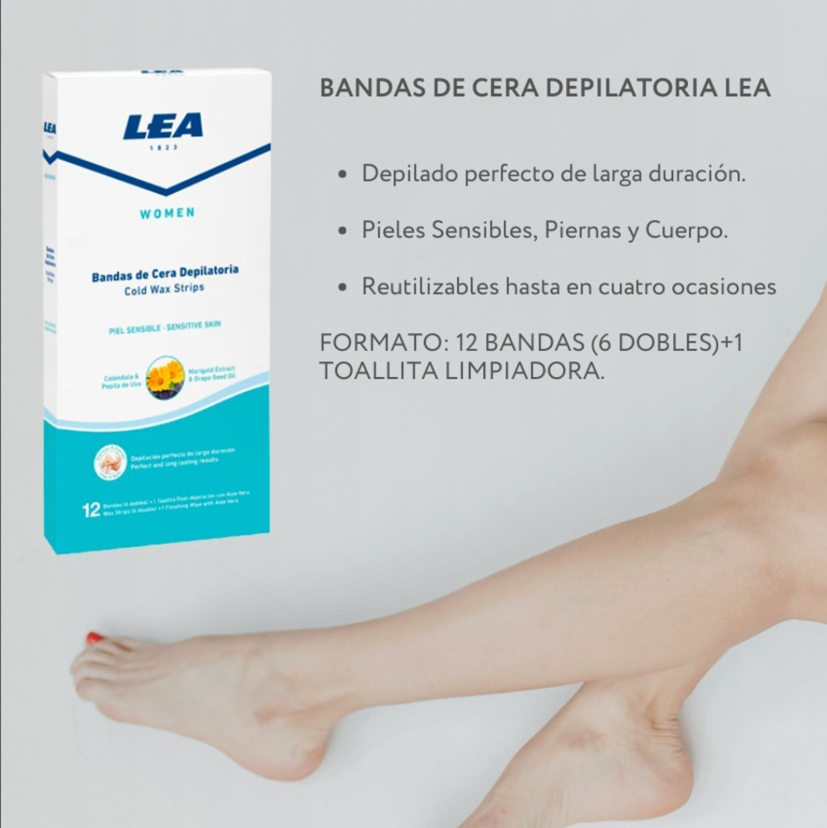 Presentación: 12 bandas (6 dobles) + 1 toallita post-depilación.